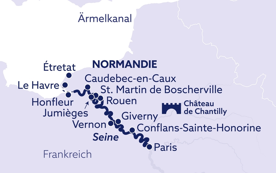Auf dieser vielfältigen Reise erwartet Sie ein intensiver Eindruck französischer Lebenskultur, gepaart mit landschaftlicher Schönheit. Genießen Sie die zauberhafte Atmosphäre reizvoller Städtchen und bestaunen Sie die imposanten Kreidefelsen an der Alabasterküste. Hier können Sie sich bei einem Bummel durch den kleinen Seefahrer- und Künstlerort Honfleur entspannen. Paris bildet den krönenden Abschluss Ihrer Kreuzfahrt.